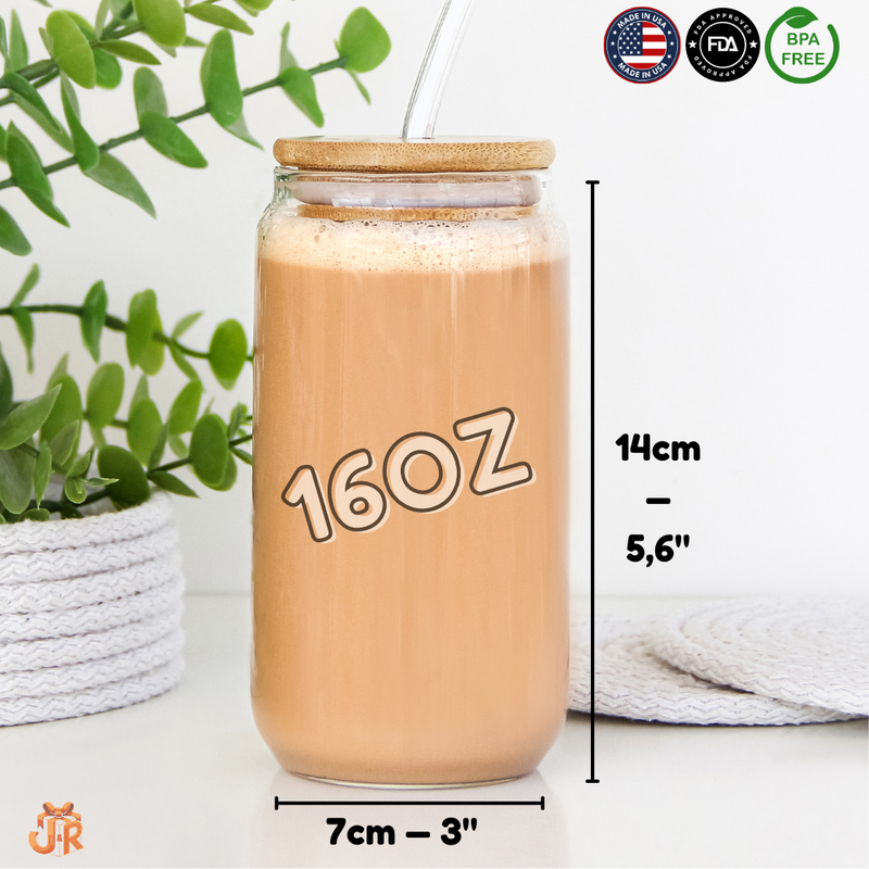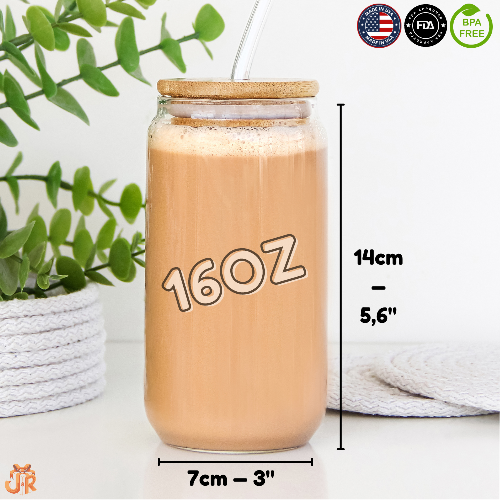 Elevate your drinkware with this personalized 16oz Glass Can, crafted from high-quality tempered glass that perfectly showcases our vibrant custom designs. Complete with a secure bamboo lid and a matching acrylic straw, this stylish and eco-friendly glass is ideal for enjoying your favorite beverages on the go.