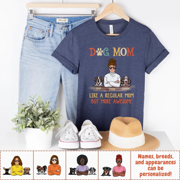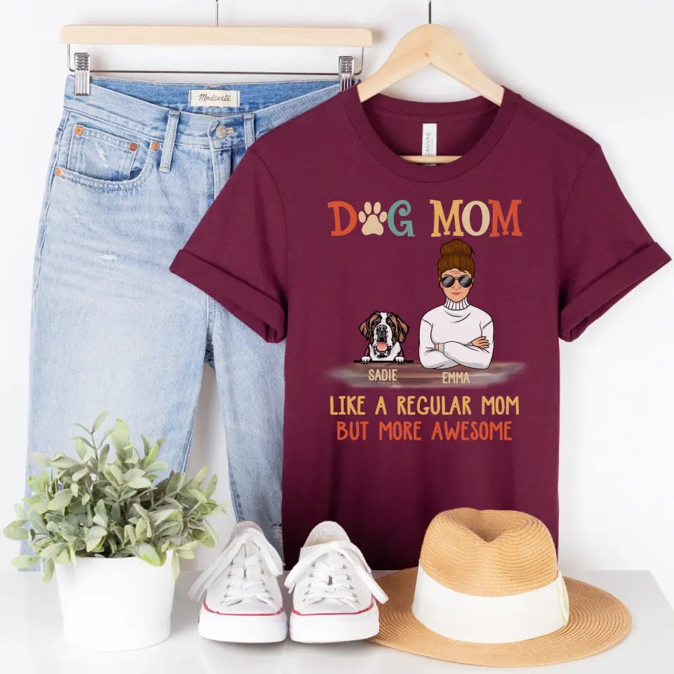 Shout out your dog mom status with our "Dog Mom, Like A Regular Mom But More Awesome" T-Shirt. Personalize the dog mom and dog avatars, plus their names and breed, or add up to 2 dogs. The paw-fect unique gift for every dog-loving woman in your life!
